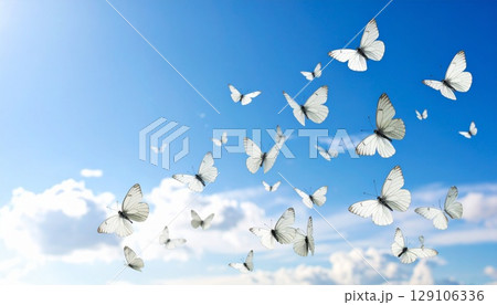 白い背景の右側を彩るカラフルな蝶の群れとコピー空間