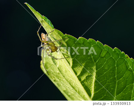 葉の上でじっと獲物を待つ蜘蛛