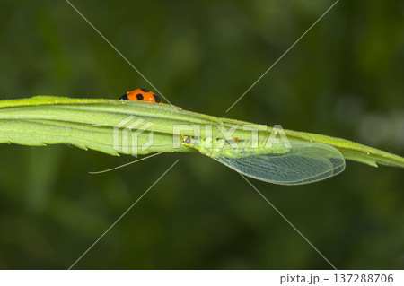 カラスノエンドウの葉っぱにぶら下がるナナホシテントウムシ