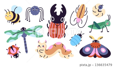 Insects doodle style. Funny funky beetles, moth, caterpillar, spider, cockroach, bee. Seasonal nature insect, forest and farm dwellers, racy vector set