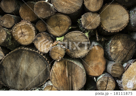 Tools and chopped firewood, a blanket lying on a log.