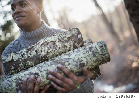 Man carrying firewood in forest in autumn.
