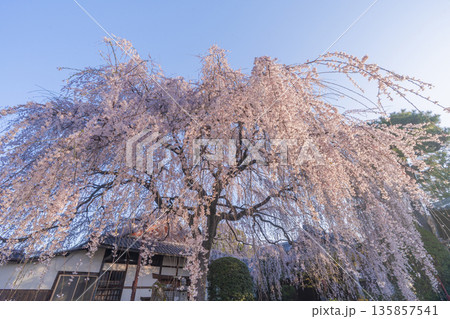 京都 立本寺 本堂と満開の枝垂れ桜