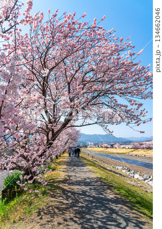 川沿いの堤防に咲く桜並木