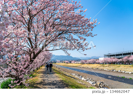 (静岡県)桜満開の河津城跡公園から眺める河津桜並木