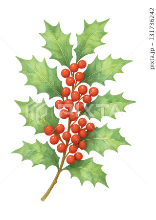水彩画。水彩タッチのベクタークリスマスイラスト。ヒイラギの水彩イラスト。
