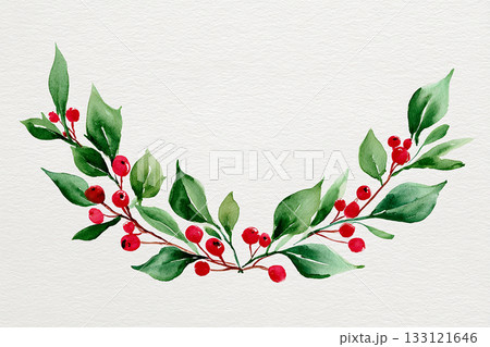 水彩風のヒイラギと赤い実のガーランドイラスト素材