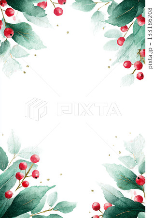 ヒイラギと赤い実のクリスマスフレーム ナチュラルで上品な水彩風の縦型背景