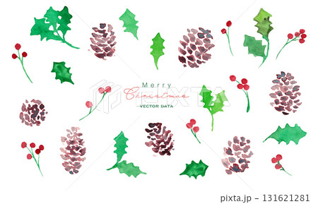 水彩で描いたクリスマスホーリー(ヒイラギ)のイラストセット