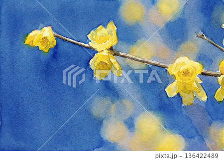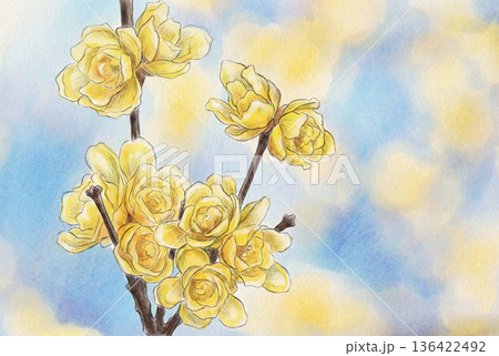 水彩で描いた白梅と蝋梅のイラスト【手描き】白バック コピースペース
