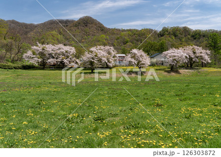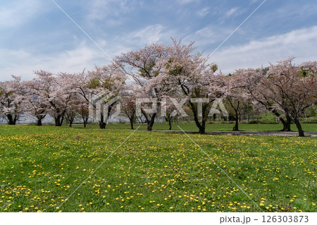 春の青空に映える満開の桜とタンポポ