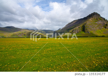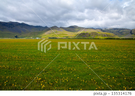 北欧の島国アイスランド共和国 島南部の道沿いに広がる一面のたんぽぽの景色