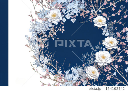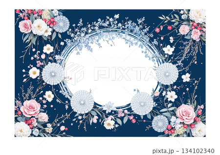 ネイビーの背景とエレガントな花々が飾る円形フレーム