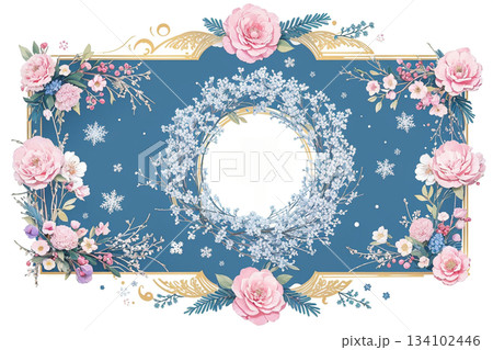 ロイヤルブルーの背景と白バラと小花のリース風フレーム