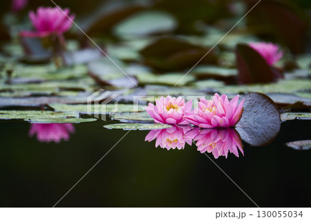 静かな池に咲く白い睡蓮と水面に映る美しい花