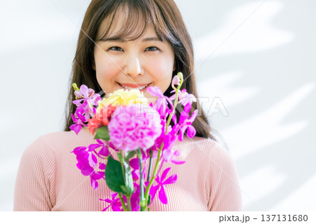 花を持つ若い女性
