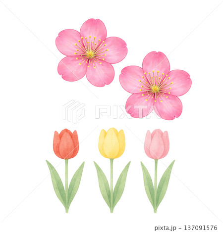 水彩風 桜風の花とチューリップのイラスト 春の花素材 切り抜きPNG