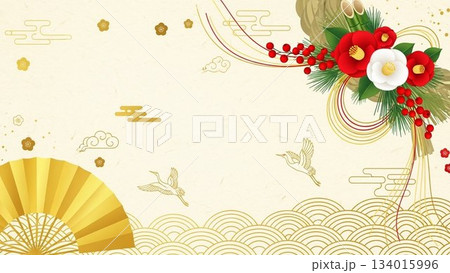 華やかな金色背景に松竹梅と鶴があしらわれた和風デザイン素材