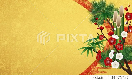 金色背景の右側に梅・竹・松を配置した和風背景デザイン(正月・新年)