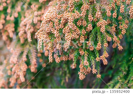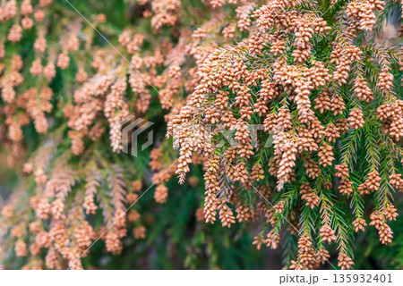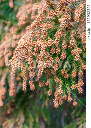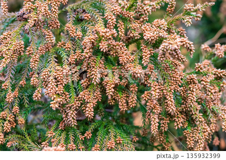 飛散直前の杉花粉・杉の雄花【花粉症イメージ素材】
