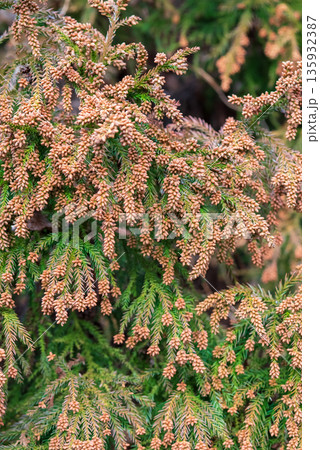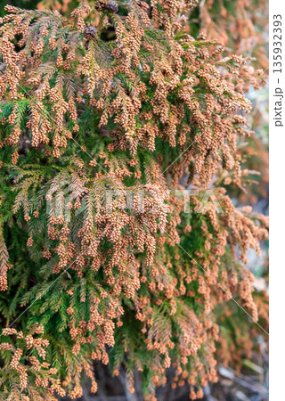 花粉を付け始めたヒノキの葉《花粉症イメージ素材》