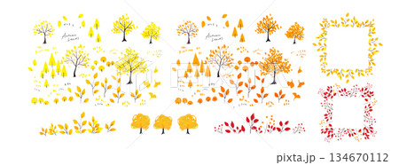 秋のカラフルに紅葉した、森の自然素材イラストセット。紅葉や木の実。ペインティングテクスチャのイラスト