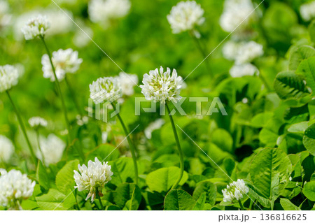 春の陽光を浴びて野原一面に咲くシロツメクサ