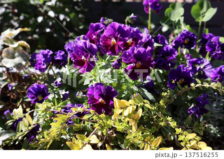 春の花壇に咲く黄色と紫のバイカラーのビオラ