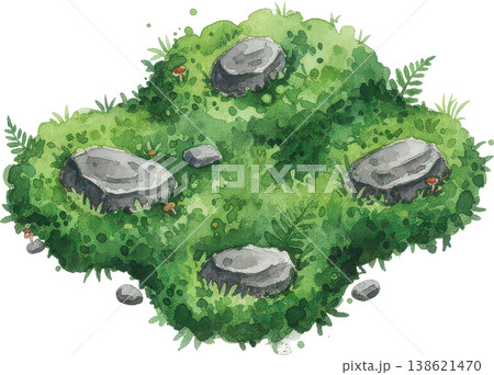 緑の苔と岩、小さなキノコが茂る森の地面 水彩イラスト