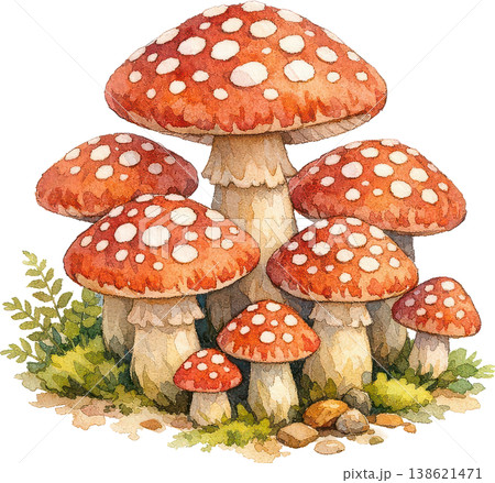 赤い斑点キノコの群生 水彩画 ファンタジーな森
