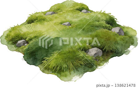 水彩画で描かれた緑豊かな草と岩の丘 自然のミニチュア風景イラスト