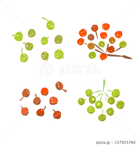 山椒の葉と赤・緑の実のバリエーションイラストセット