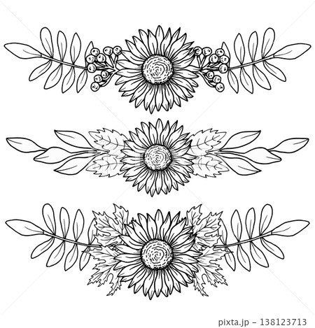 Set of sunflower frames with maple leaves and rowan berries. Botanical vector art. Black graphic illustration, hand drawn using line art. Suitable for frames, packaging and seasonal projects