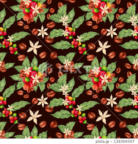 Seamless pattern featuring a branch of Arabica, Robusta coffee trees with beans, berrie, flower. International Coffee Day. Hand drawn watercolor illustration. Suitable for fabric, textiles, packaging.