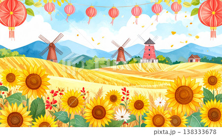 ひまわりのイラスト フレーム 背景素材 16:9サイズ AI生成素材