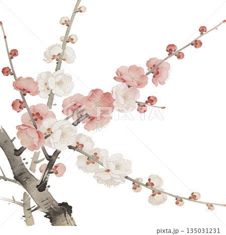 紅白の梅の花が咲く枝の和風ベクター素材イラスト|梅, 花, 正月