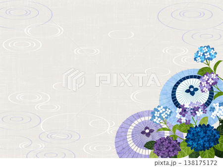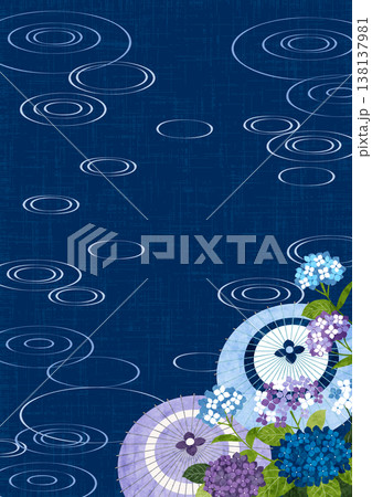 和傘とあじさい、背景、波紋、梅雨、和風、青、縦