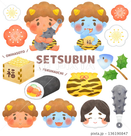 日本の節分行事イラスト素材セット(鬼の顔・お多福・イワシ・豆・和柄)