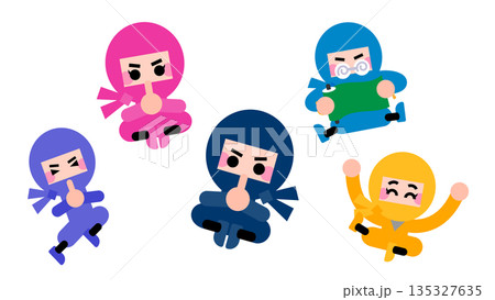 色違いで並ぶかわいい忍者キャラクターのイラストセット