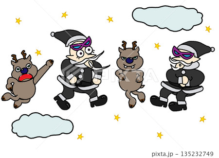 いたずらをしながら夜空を飛び回るブラックサンタとトナカイのイラスト