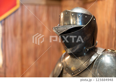 Medieval Knight's Polished Steel Armet Helmet. Detailed close-up of a shiny, historical piece of protective headgear worn by knights in the Middle Ages.