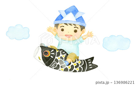 【端午の節句】鯉のぼりに乗った男の子のイラスト