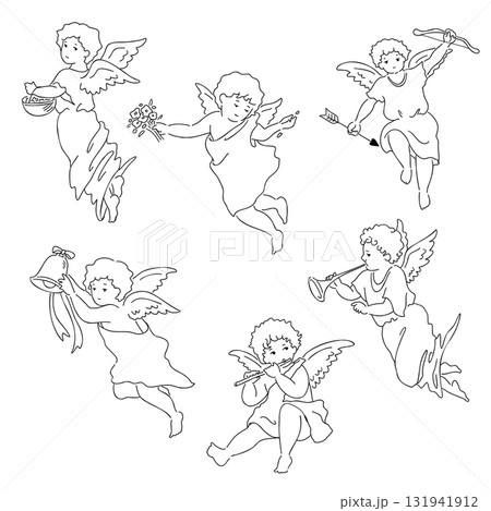 ゆるくてかわいい天使の子ども達とバラのイラスト 線画セット
