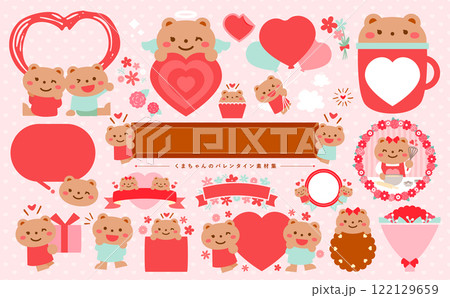 ハートやチョコ・お花のバレンタインのかわいいくまの動物イラストとフレームの素材