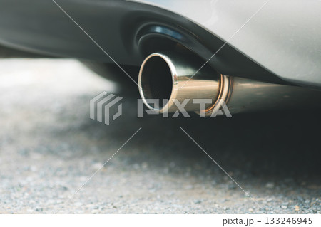 【自動車メンテナンス】リフトアップした自動車のマフラーのクローズアップ