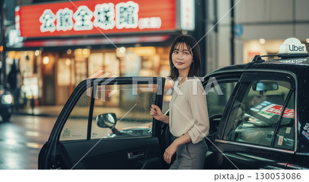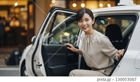 タクシーから降りるビジネスウーマン