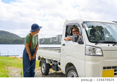 高齢女性と軽トラック 【撮影協力:隠岐シーサイドリゾートみやび様】