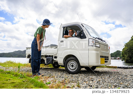 軽トラックで湖畔の旅行 【撮影協力:隠岐シーサイドリゾートみやび様】