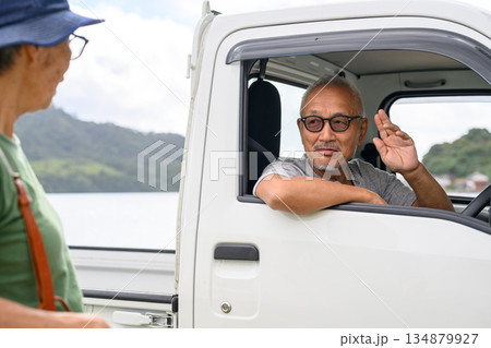軽トラと高齢者二人の挨拶 【撮影協力:隠岐シーサイドリゾートみやび様】