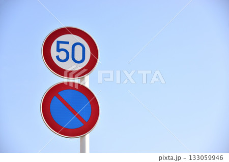 複数の交通標識 一時停止と駐車禁止と補助標識